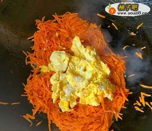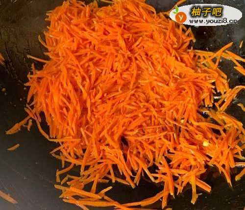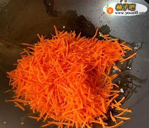 5再加入少量食用油,将胡萝卜丝倒入锅里一起翻炒