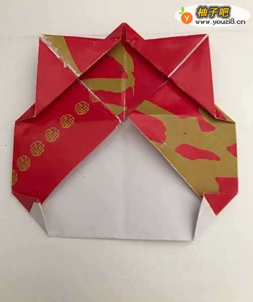 3第三步 四个角都向中心折叠好之后 再把下面的那个角翻折倒背面 然后掀起左上角和右上角向下对齐中心点折叠
