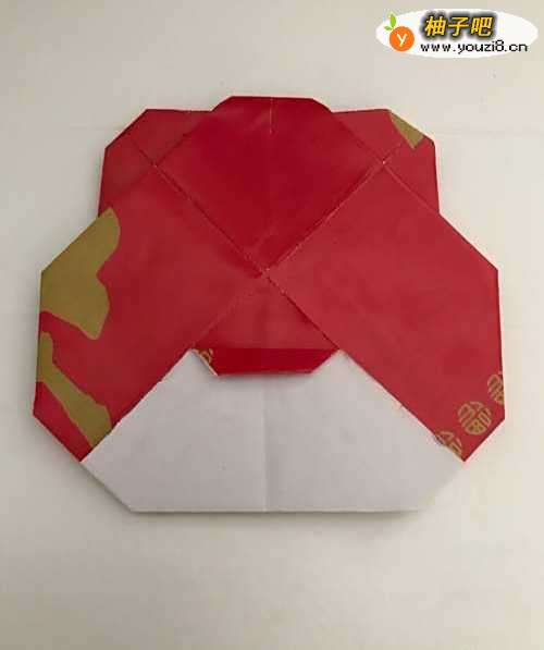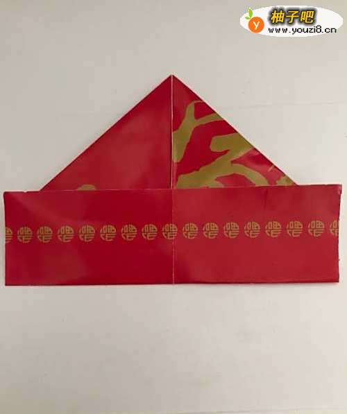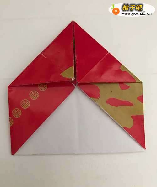 7第七步 两个上角沿中线向下折好之后 再掀起来下边向上超过中心一小段距离之后 再把它折倒
