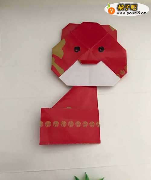5第五步 折叠好之后 把它翻到背面 再把头部上头中间的尖角向后折倒 两边的耳朵尖角也是向后折倒 下面的白色尖角向下连续折叠两次