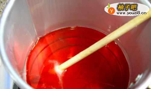 3给凝胶蜡添加颜色。在凝胶蜡中滴加几滴酒红色的染色剂,这将使蜡烛看起来更像红酒。