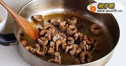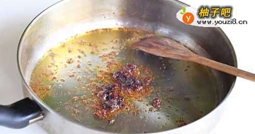 7锅里倒适量油,油热后把辣椒酱倒进去煸炒出香味