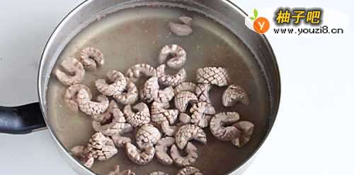 4锅里加入料酒、胡椒,再倒入适量水,烧开后把腰花倒进去焯水,腰花卷起来后即可捞出