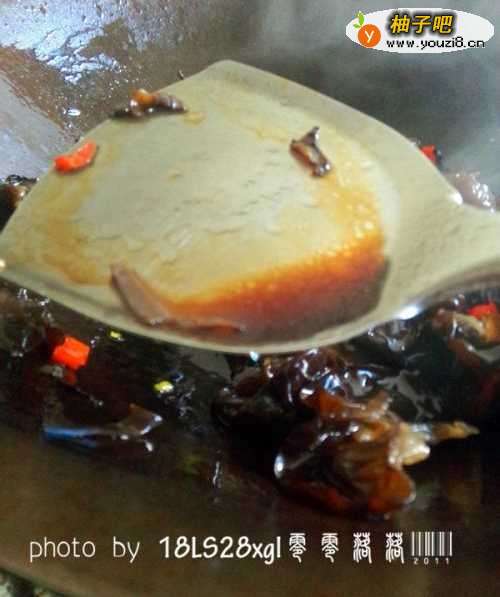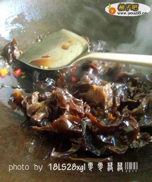 4热锅里倒入适量油烧热,爆香葱白、小米辣,把木耳放入锅里翻炒1分钟;