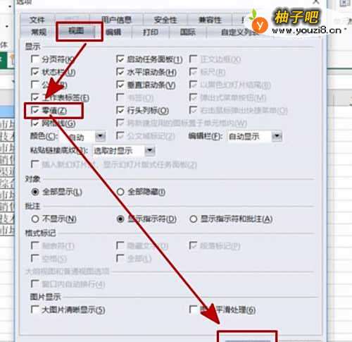 2点击【选项】后会出现一个“选项”对话框,点击【视图】按钮,取消【零值】前面的对勾,具体操作如图所示: