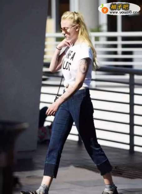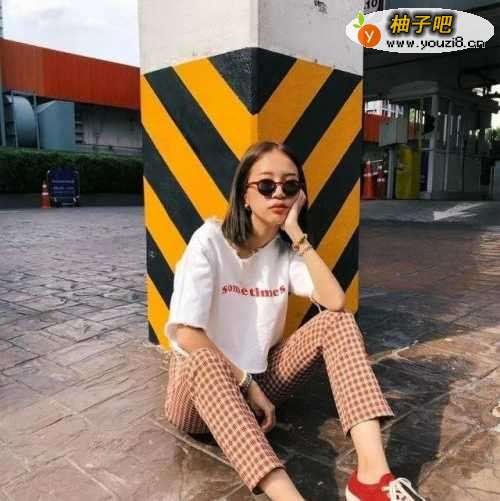 5白色字母宽松T恤搭配格纹九分裤搭配红色帆布鞋,非常休闲的搭配,却是有很强的高级感,给人一种很高大上的感觉。