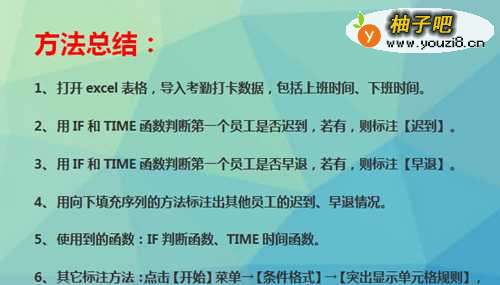 在考勤管理中,对于早退、迟到,都会进行特殊处理,此时就得将它们标注出来。我们可以将考勤机连接到电脑,将考勤数据导到excel表中,然后标注打卡上下班时间和迟到早退情况。小编分享一种方法,利用IF和TIME函数,1分钟就能实现以上要求啦!