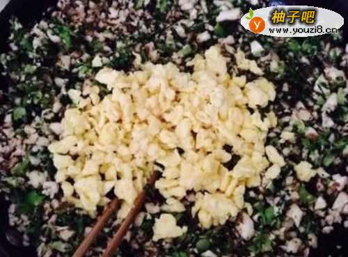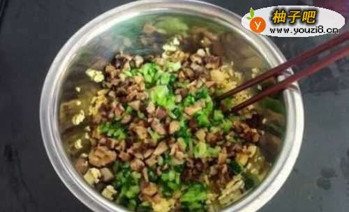 4用温水泡开香菇干,将香菇与鲜油菜洗净焯水。香菇切成细丁,油菜切碎沥干水分,倒入盆内,并将鸡蛋也倒入盆内。