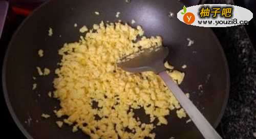 3鸡蛋加入少许盐打散,锅内加油烧热,倒入鸡蛋炒散。