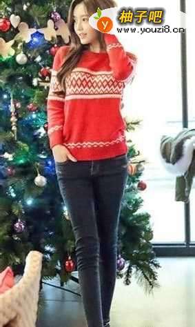 6红色毛衣上采用白色的几何图案点缀,很有圣诞节的感觉,显得清新活泼,提升时尚感,配深色牛仔裤潇洒帅气,凸显长腿。