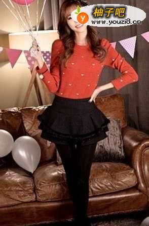 4红色毛衣简约的套头款式,较为修身的版型,显得比较有女人味,上面点缀着小巧的心形图案,精致可人,配黑色半身裙甜美大方,活泼热情。
