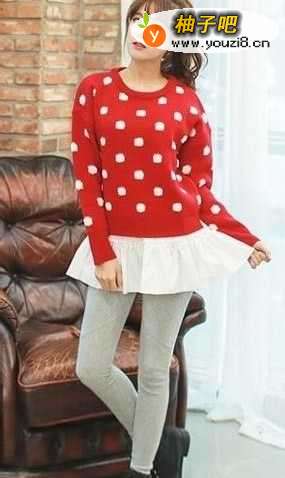 这款红色毛衣版型圆润可爱,穿出清新减龄的感觉,毛衣上点缀着白色波点,甜美俏丽,下摆采用白色裙摆式拼接,活泼娇俏,增添小女生的灵动魅力。