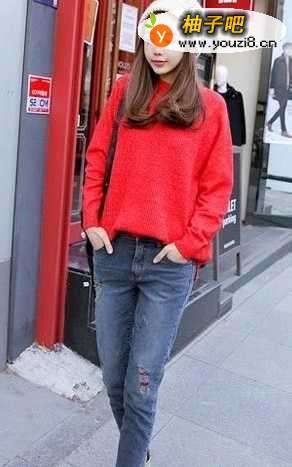 3红色毛衣个性的落肩设计,时髦有范儿,宽松版型穿起来随意自在,给人一种冬日里的慵懒感觉,配破洞牛仔裤,时尚休闲,很舒服的一身穿搭。