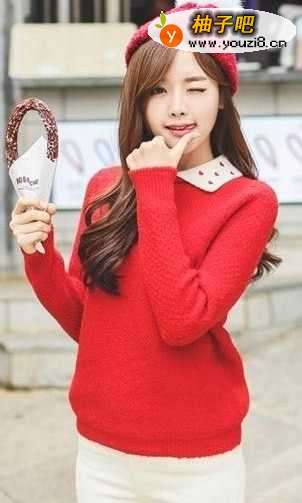 7这款红色毛衣纯色设计,鲜艳抢镜,穿出热情大方的感觉,内搭白色衬衫,混搭穿法显得很清纯,配白色紧身裤十分清新。