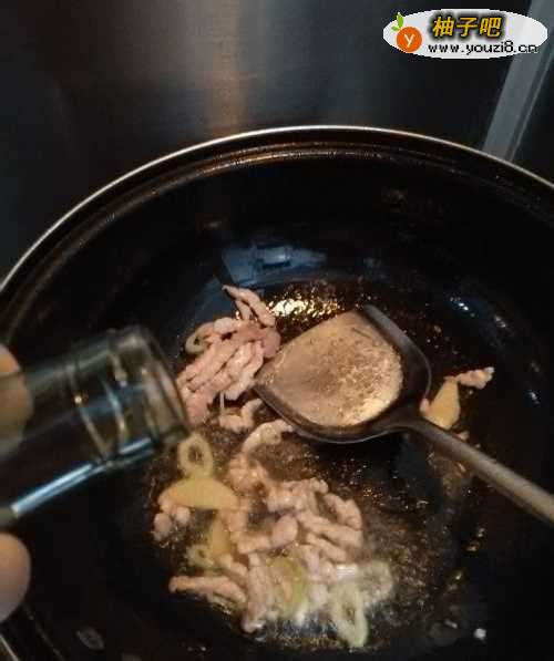 5先在锅中倒入适量的料酒,增加肉丝的香味。