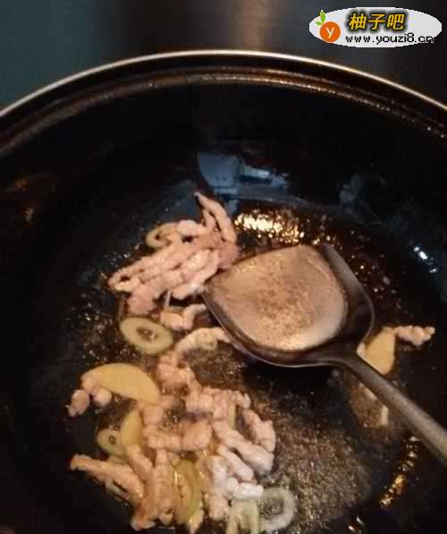 4将肉丝放入锅中,用铲子快速翻炒,这样不会粘在一起。