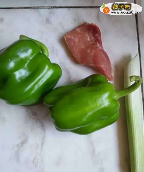将甜辣椒洗净,再准备一块猪肉和一根大葱。