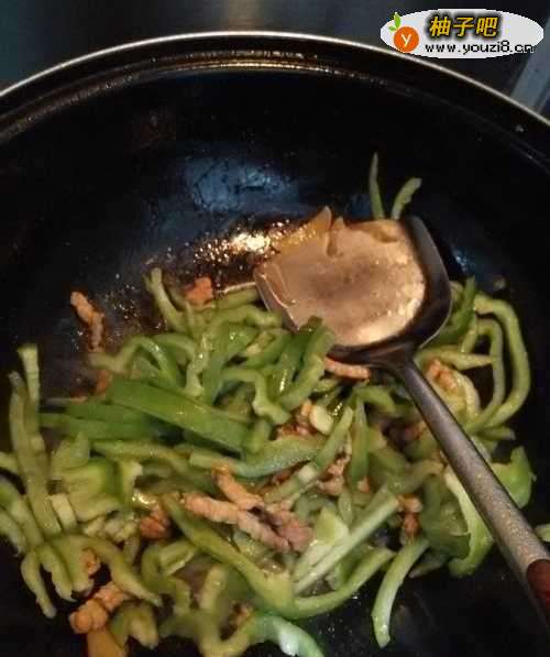 7肉炒出香味后,将甜辣椒丝倒在锅中,翻炒均匀。