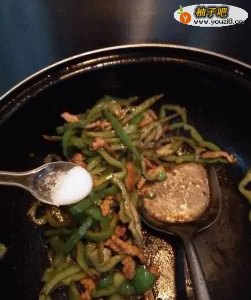 10将肉丝和甜辣椒丝炒熟炒匀,就可以出锅了,颜色翠绿,香味特浓,非常好吃。