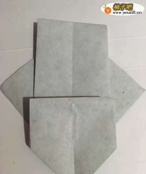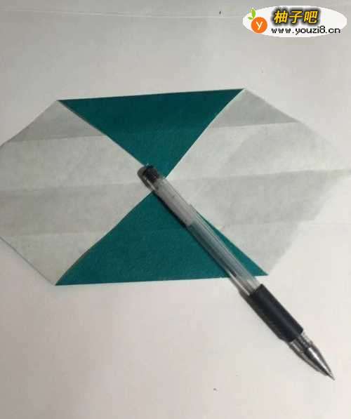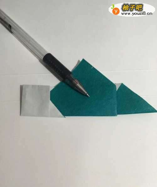第一步 首先把一张16厘米X16厘米的正方形绿色彩纸 从下向上对角折叠整齐