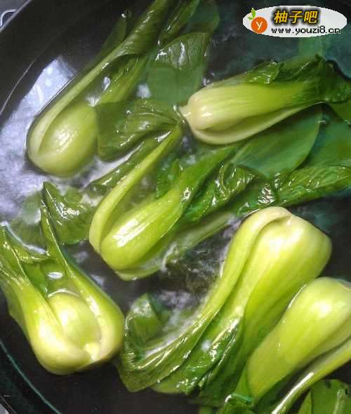 6大白菜过滚水,放入盐,捞起。放芝麻油拌匀,拼盘。