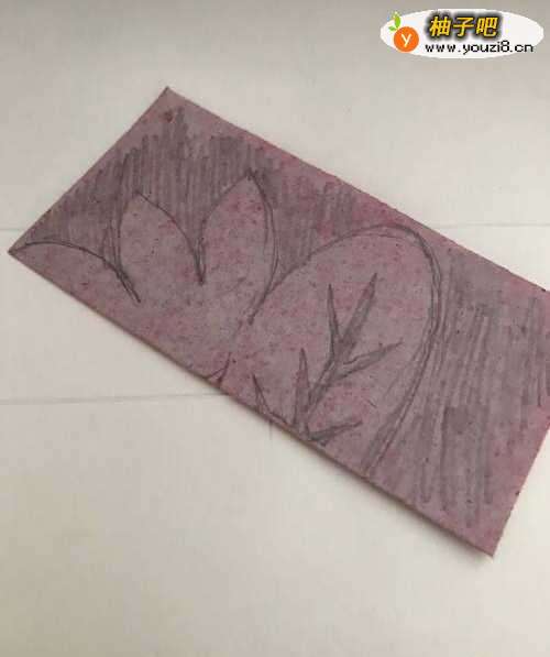2第二步 对折好之后 再把它竖起来 双边放在左边 然后拿起绘图铅笔画上几瓣简单的荷花草图轮廓
