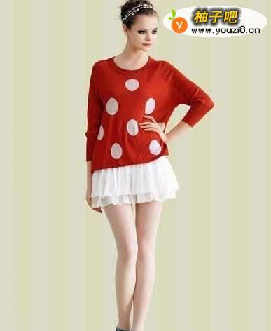 6宽松针织衫不修身型,却恰恰能减龄,即便将近30的年龄,也能扮出20刚出头的妙龄。蝙蝠袖休闲,同时也能将赘肉隐形,白色大波点零散点缀其上,与同色系蓬蓬蛋糕短裙相得益彰。
