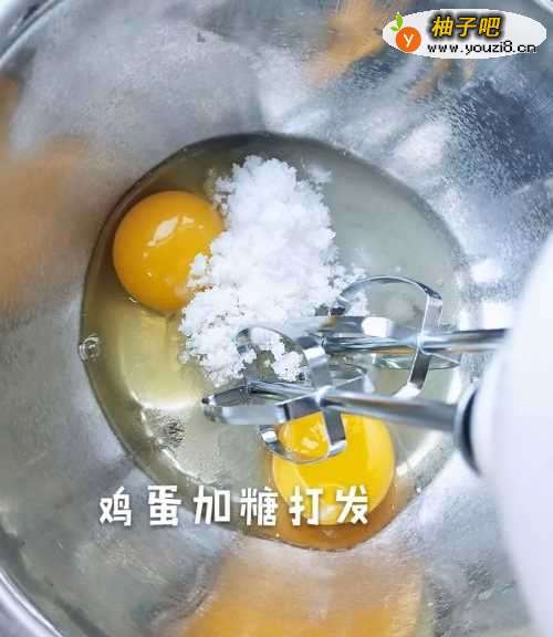 首先在一个碗中打入两颗鸡蛋并加入糖,用打蛋器高速打发,如下图所示。