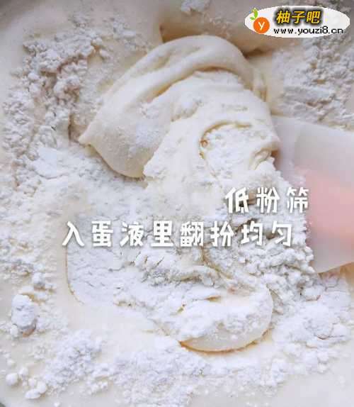 4低粉过筛加入蛋液里搅拌均匀,如下图所示。