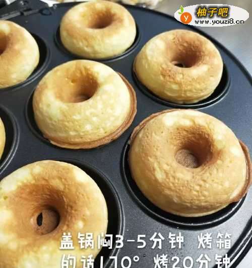 7接着盖上盖子闷三到五分钟,如下图所示。小贴士:如果大家家中没有专门做甜甜圈的工具,可以把甜甜圈放到烤箱中,开170°的火烤20分钟左右,也是可以的。