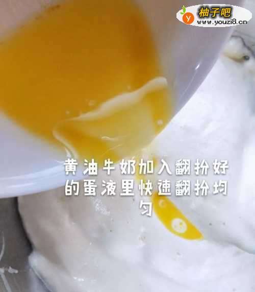 5接着把黄油牛奶加入刚才搅拌好的材料中,搅拌均匀,如下图所示。