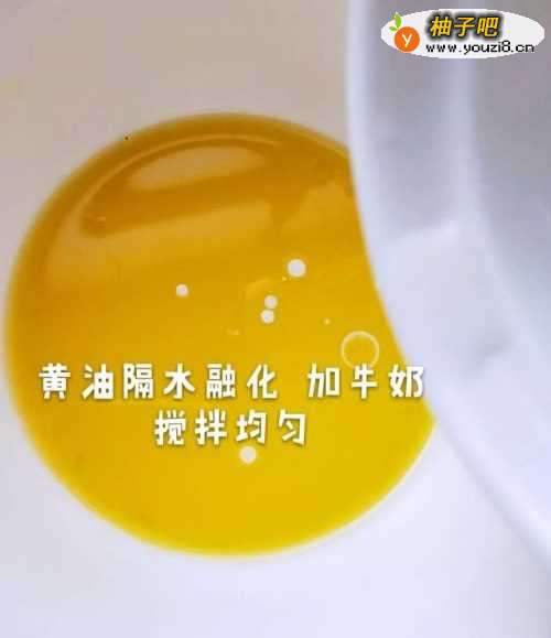 3接着把黄油隔水融化,加入牛奶搅拌均匀,如下图所示。