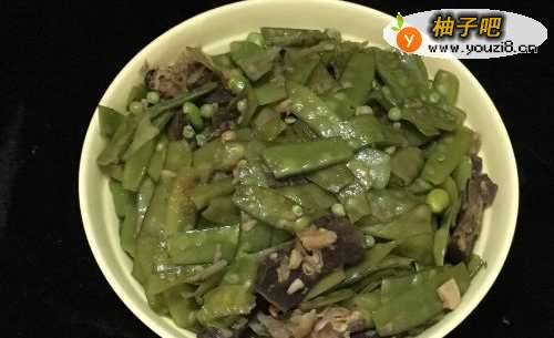 5接着放牙兰豆,煸炒均匀。