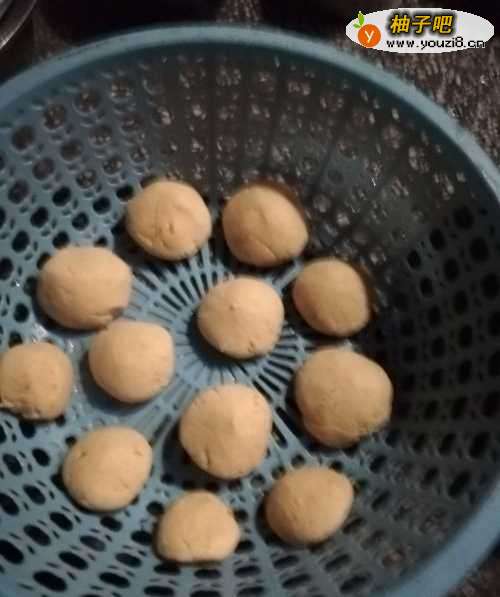3将揉好不粘手的老南瓜面团捏成小个(很小很小),同时稍微压扁一下。