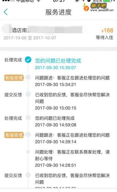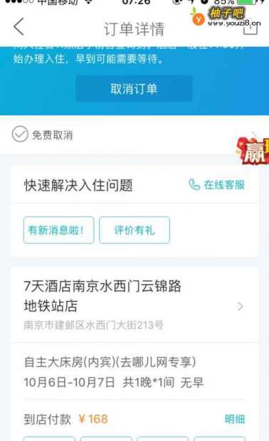 3我们打开,进入订单查询,点击某个订单进入页面后,会看到上面有一个在线客服,有疑问可以询问,这个客服是客服,可以让她帮你和酒店沟通。