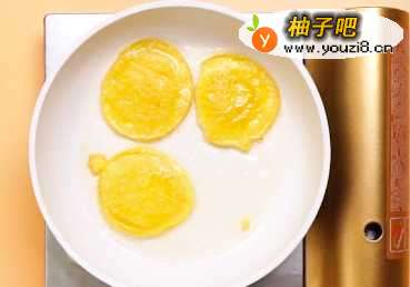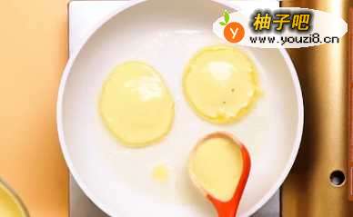 3锅里放食用油约10毫升,倒入面糊摊成饼状;