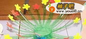 3然后把每一条的塑料条往下折一下,这样就塑料条就散开了。在彩色纸上面剪一些形状的彩纸贴上去。 也可以用不同的材料来装饰瓶子。
