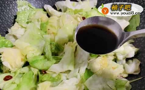 5将圆白菜炒至叶子有点软了,这个时候放入生抽,陈醋继续大火翻炒,加入陈醋呛至圆白菜,不仅能促使圆白菜能更快的入味,还能促使圆白菜特别清脆爽口