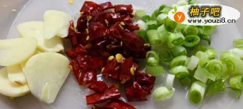 2再将小葱切成葱花,大蒜切成薄片,干红辣椒切小段全部放在一起备用,干红辣椒最好是提前用清水浸泡一会,浸泡后的辣椒,在炒至的时候不容易被炒糊。