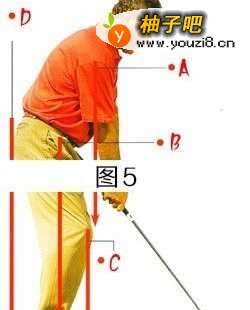 按照一般法则,球杆长,则上体倾斜少,反之亦然。用沙坑杆与用1号木杆相比,上体倾斜更多,这是因为球杆短,杆身更接近垂直。