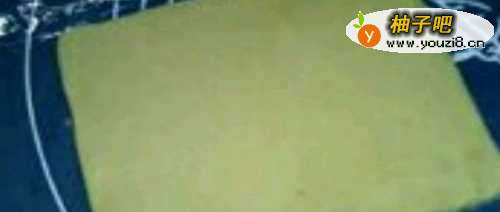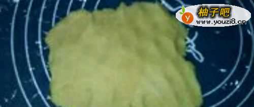 2接着以上的步骤,记得在案板上要铺上保鲜膜,用擀面杖把已经揉压好的白豆沙来回赶,用力要均匀,如下图所示。
