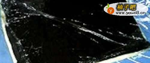 3然后,把白豆沙按压平整如下图所示,把它按压成16*10厘米的片状,厚底要适宜,再用小刀把四周修整平整。同样,另外铺一张保鲜膜,放上枣泥,擀成同样大小的片状。