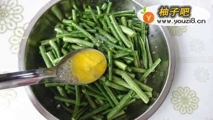 2这时候。我们将鸡蛋搅散,放入豇豆段中搅拌;