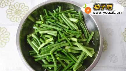 首先,我们用清水将豇豆洗干净,然后切成寸段,撒一点点盐拌匀;