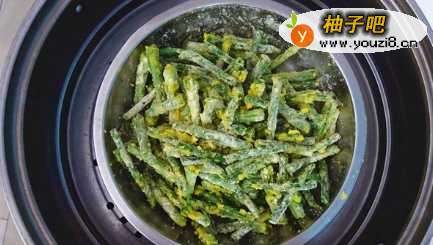 5拌好的玉米面豇豆,放入蒸锅,上汽后蒸10分钟即可;