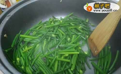 4接着,将洗净的韭菜下锅爆炒,翻炒几下就可以加入适量的盐。因为前面的鱿鱼没有加盐,所以这里的盐可以加多一些。