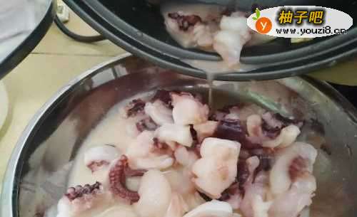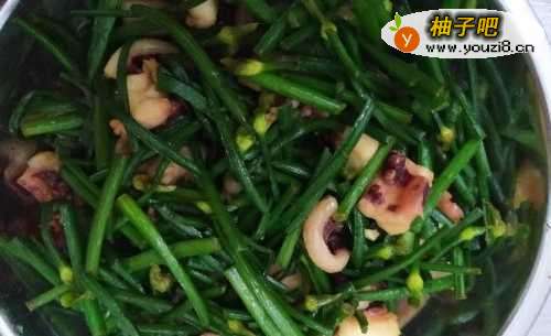 3等到鱿鱼差不多熟了,就可以找一个盘子来装,锅可以用来炒韭菜。