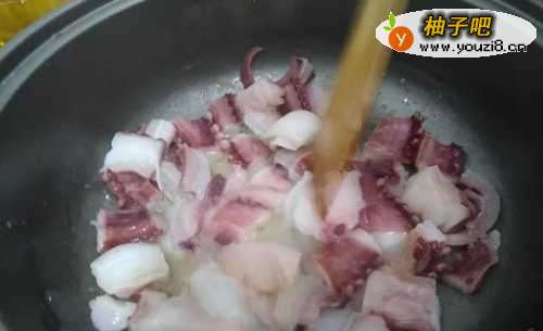 2接着,热锅然后倒入油,将鱿鱼倒入进行爆炒。如图所示。