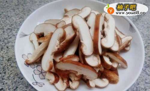 2鲜香菇去蒂,洗净后切片。(香菇蒂可以留下来,裹在面糊里下锅炸制,也是相当美味的。)