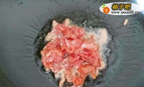 5热锅倒油,放入肉丝滑炒至变色后,放入蒜末炒香。